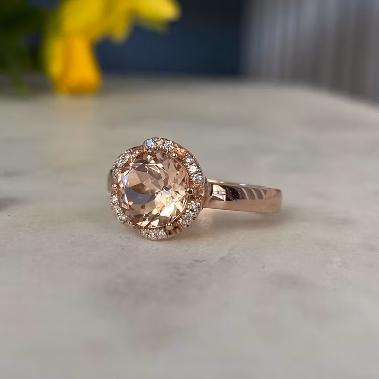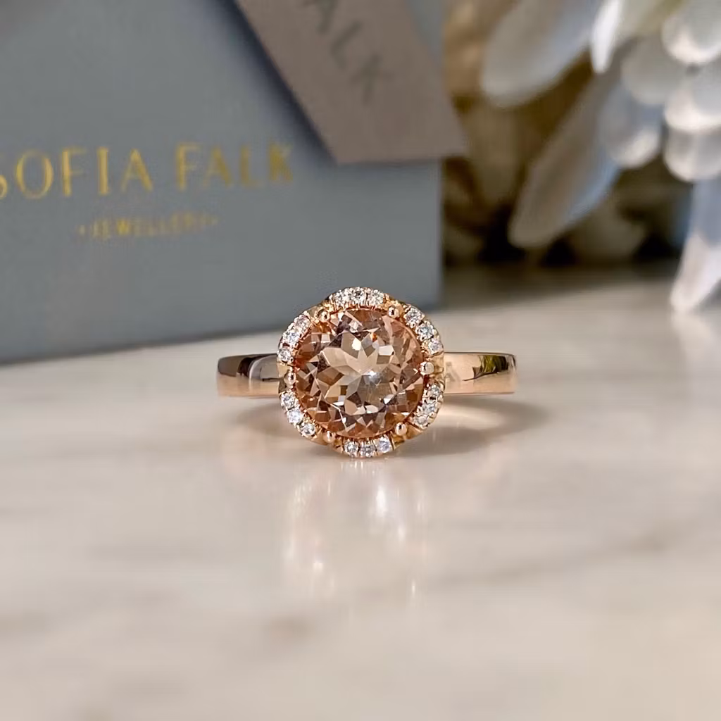 FLORAL BY Sofia Falk ring - Morganit består av en aprikosfärgad morganit som omgärdas av 18 diamanter (tot 0.18 ct). Ringen kan fås i vitt, gult eller roséguld (18K).
